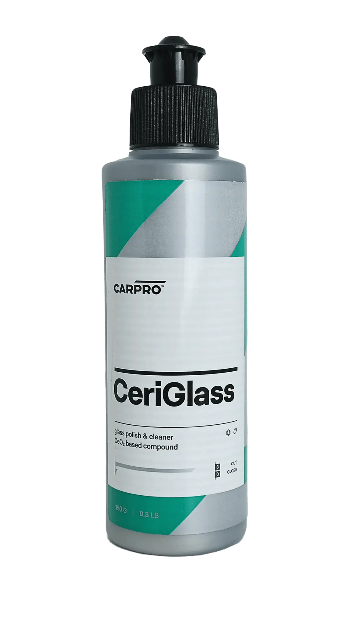 CeriGlass is a unique glass polishing system developed by the innovative technique of blending special ceramics together with other nano components and mild abrasives to create the most user friendly and still effective glass polishing system! It quickly removes acid rain spots, hard water spots, road film, and stubborn bird stains. It is also capable of removing fine to medium windshield wiper/grit scratches and swirls! And it does all this without warping the glass.