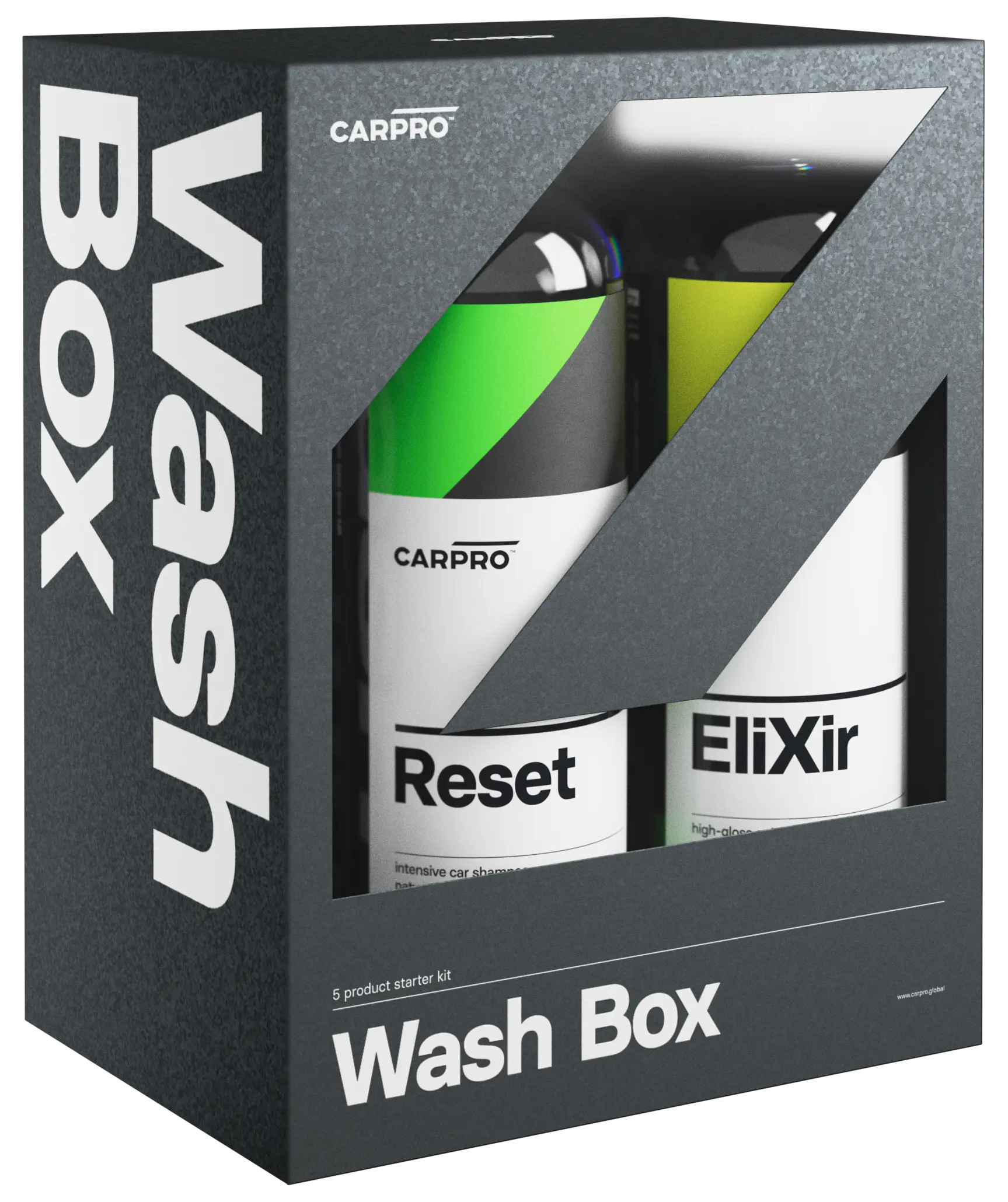 See vinge hoolduskomplekt oli SEMA 2019 messil KUUM teema. Hankige oma lähedastele, klientidele või isegi endale täiuslik pesukasti komplekt! CARPRO Wash Box sisaldab viit meie lemmiktoodet ühes! Alustage auhinnatud CARPRO Resetiga, kasutades sõiduki pesemiseks kaasasolevat kinda. Seejärel kuivatage see hõlpsasti, kasutades uskumatut CARPRO DHydrate rätikut! Lõpuks lisage läiget ja kaitset üliläikiva CARPRO Elixiriga ja kaasasoleva CARPRO 2 Face rätikuga!