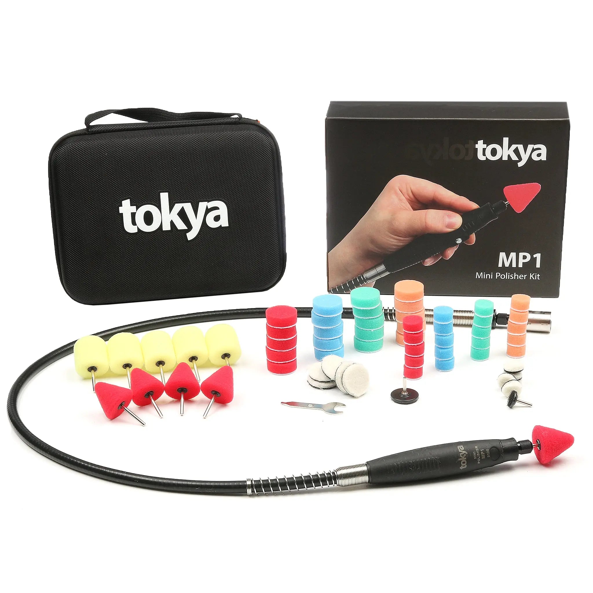 Tokya MP1 on pöörleva poleermasina pikendusvars, mis võimaldab hõlpsasti töötada kitsastes kohtades. Komplektil on mitu erinevat poleerimispead, mis sobivad erinevatele pindadele.